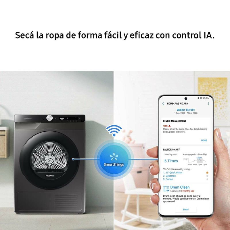 Con un secado impulsado por IA SmartThings secá tu ropa más fácil y eficazmente. El sistema de gestión inteligente de SmartThings mejora el rendimiento con base en tus patrones de uso, mientras que Funciónes como ‘Laundry Recipe’ recomienda los mejores ciclos de secado y ‘Laundry Planner’ optimiza tu programa de secado. Además, el ‘HomeCare Wizard’ permite resolver problemas a distancia. También desde SmartThings podrás recibir las notificaciones del secarropas en todos tus dispositivos compatibles.