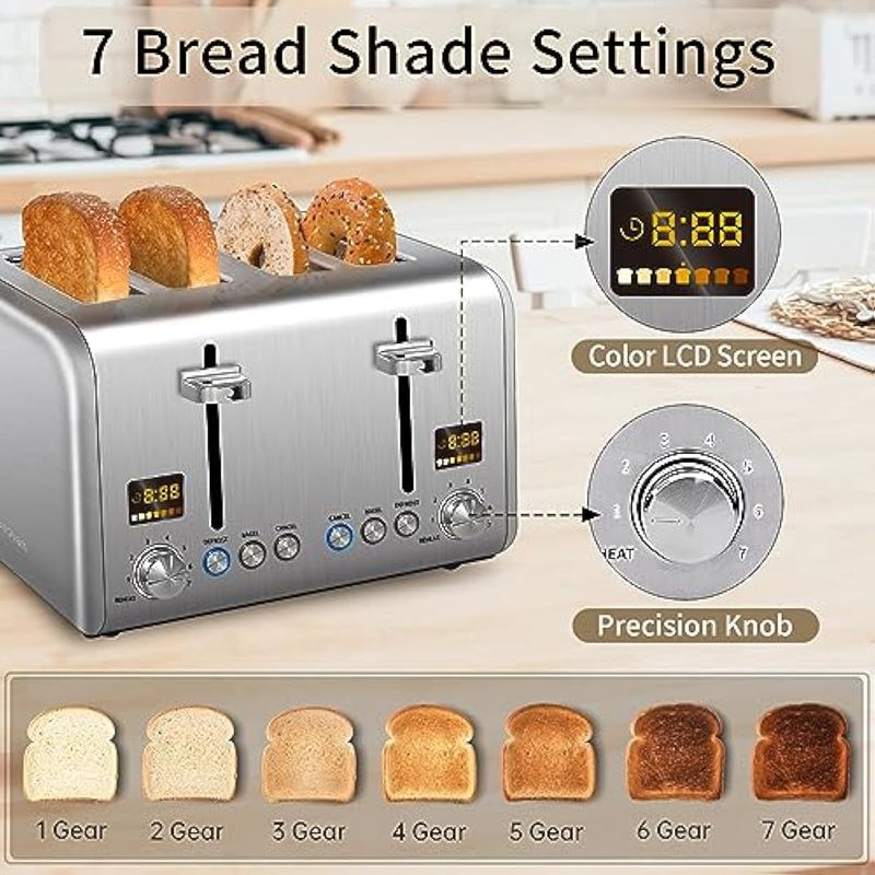 SEEDEEM TOSTADORA DE 4 REBANADAS, TOSTADORA DE PAN INOXIDABLE, PANTALLA LCD A COLOR, 7 AJUSTES DE SOMBRA DE PAN, TOSTADORA DE RANURAS DE 1.5 PULGADAS DE ANCHO CON FUNCIONES DE BAGEL/DESCONGELACIóN/RECALENTAMIENTO, BANDEJA EXTRAíBLE PARA MIGAS, PLATEADO METáLICO, 1800 W