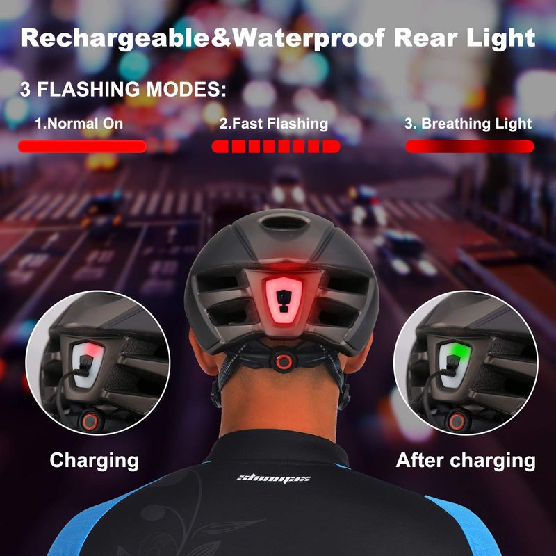 Luz rara recargable por USB: el casco de bicicleta especializado está diseñado con luz LED recargable por USB enchufable, 3 modos de iluminación roja de seguridad, casco de bicicleta. Luz normal, parpadeo rápido y respiración que puede recordar a otros conductores o autos detrás de ti que reconozcan tu dirección claramente, hace que tu ciclismo sea más seguro y brillante por la noche o en la oscuridad. La luz trasera es impermeable, empapada en agua todavía se puede utilizar.