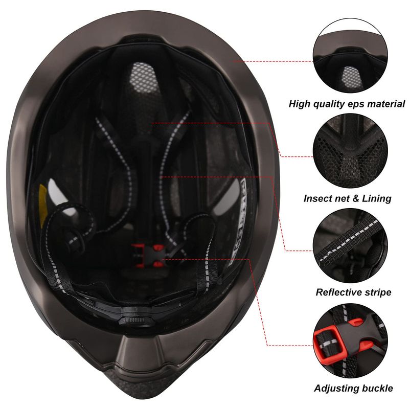 Tiras reflectantes ajustables: cascos de bicicleta para hombres y mujeres diseñados con tiras reflectantes ajustables. Su función es la misma que la luz LED. Puede ayudar a otros ciclistas detrás de ti a reconocer claramente tu dirección, más seguro y brillante en el ciclismo nocturno.