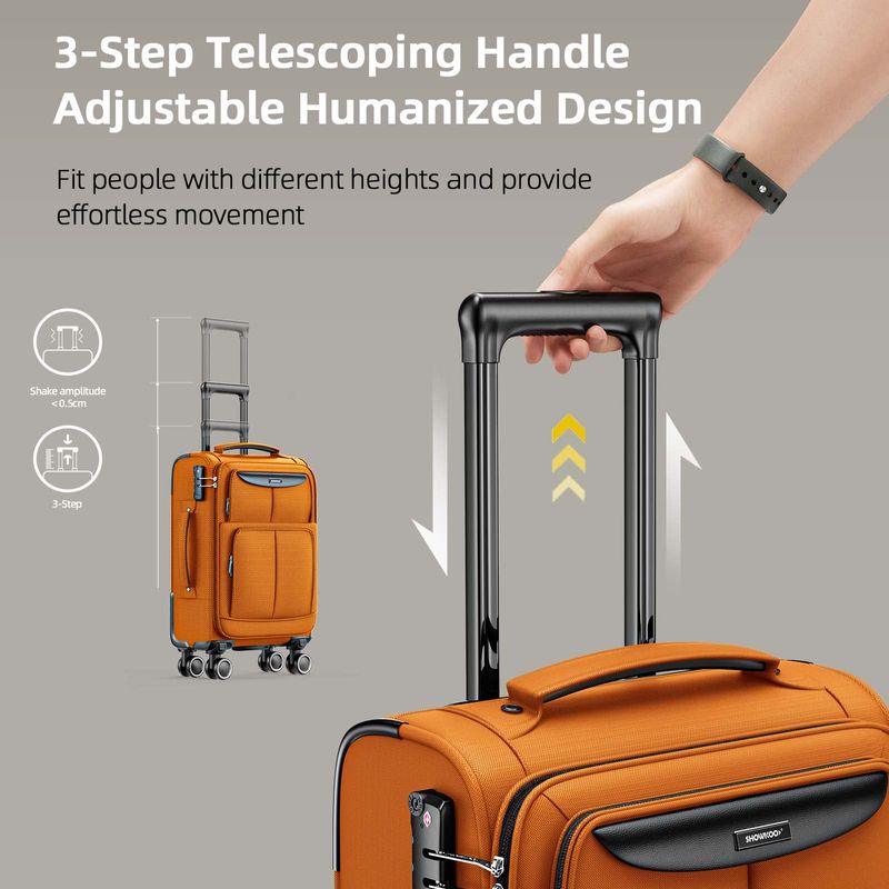 Mango ergonómico de hierro duradero de 3 pasos: El mango multinivel con botón se puede ajustar a diferentes alturas, mientras que minimiza el efecto de la rueda magnética oscilante y autoalineable y puedes desplazar la parte superior recta en cualquier dirección. El mango se bloqueará cuando esté completamente extendido para que puedas empujar o tirar de la maleta. Cuando está completamente empotrado, el mango también se bloqueará, lo que reduce en gran medida el riesgo de daños cuando no está en uso y es fácil de usar.