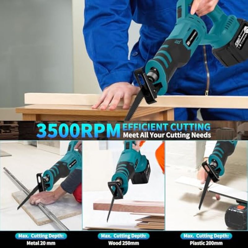 Lo que obtienes: 1 sierra recíproca inalámbrica, 2 baterías de 6.0 Ah, 1 cargador rápido, 12 hojas de sierra adecuadas para metal, maderaPVC, 1 caja de tela portátil