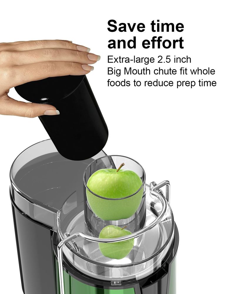 Conducto de 3 pulgadas de ancho: alimenta frutas y verduras enteras en el exprimidor centrífugo con poca preparación. Su diseño superior supera a otros para jugo fresco y casero diario.