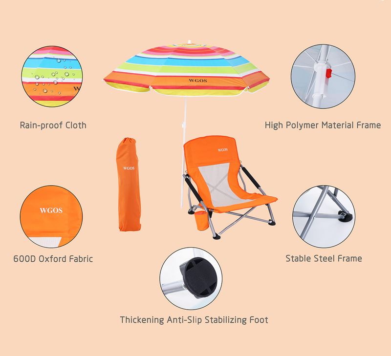 Diseño mejorado con paraguas: una silla de playa plegable de respaldo bajo con un paraguas plegable plegable desmontable compacto. El anclaje de arena incluido sujeta firmemente el paraguas. La dimensión de las sillas de playa es de 22.6 x 24.4 x 23.6 pulgadas largo x ancho x alto, y la dimensión de la sombrilla es de 52.4 x 56.7 pulgadas ancho x alto. La tela trasera de malla hace que la silla sea transpirable y fresca.