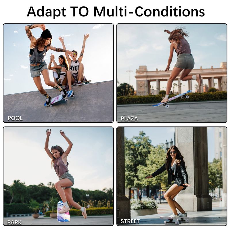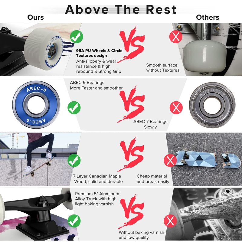 Sólido y duradero: el tablero es de 0.394 in de grosor y está hecho de 7 capas de arce canadiense, peso máximo de carga de hasta 220 libras, equipado con camiones de aleación de aluminio de 5 pulgadas. Fiable para principiantes y expertos