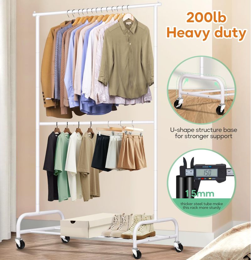 Seguro, fuerte y estable: el perchero resistente utiliza una estructura en forma de U para un soporte más fuerte, 1.000 in de diámetro. Todos los tubos de acero, punto de soldadura suave, hacen un perchero resistente que soporta hasta 150 libras de carga, el perchero con ruedas le da a tu ropa pesada un apoyo estable durante años, puedes decir adiós a los percheros tambaleantes y doblados para colgar ropa.