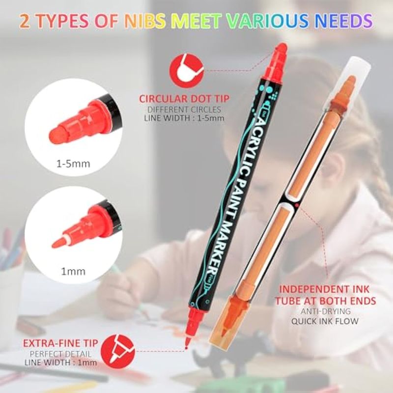 Regalo ideal: nuestros bolígrafos de pintura acrílica de doble punta adoptan tinta ecológica y cumplen con el certificado EN71 que es insípido, resistente a altas temperaturas, duradero, sin fugas, y tiene una gran cobertura. La elección ideal para manualidades y proyectos de adornos navideños como Navidad, Halloween, día de Pascua, día de San Valentín, día de Acción de Gracias, Año Nuevo o regalos especiales de vacaciones.