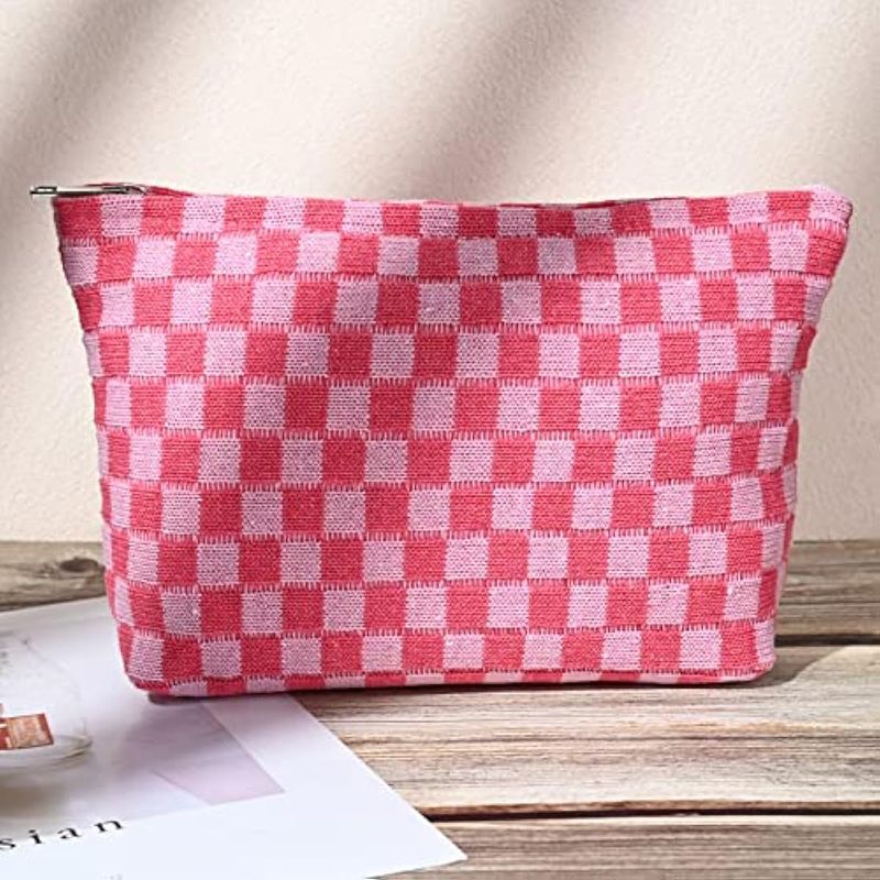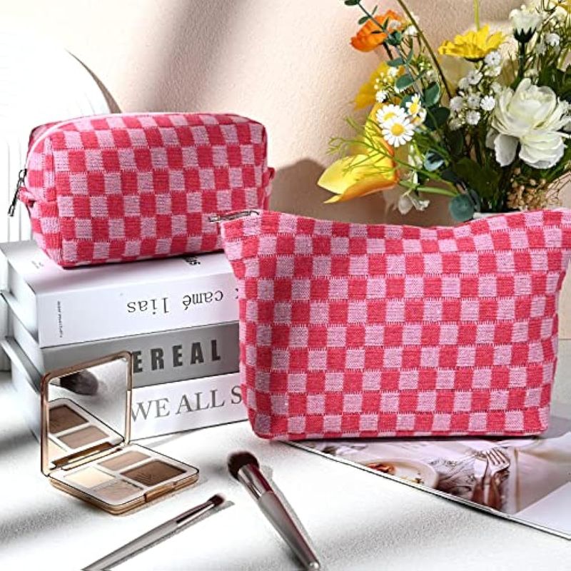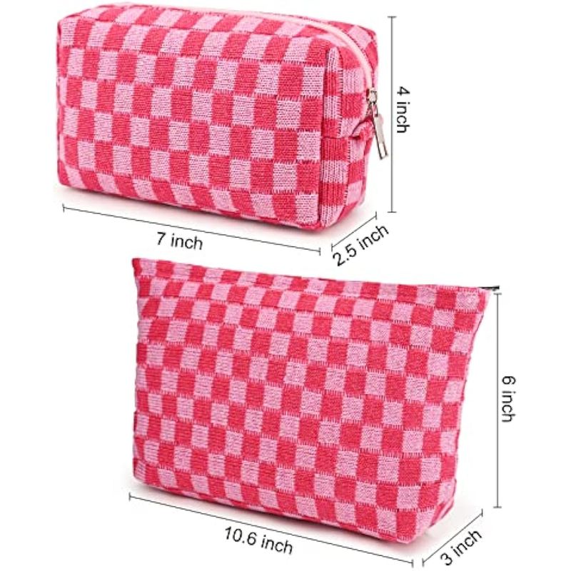 Diseño de moda: recibirás 2 bolsas de maquillaje a cuadros rosas en total, diseño de patrón distintivo y color a juego, original y siempre popular, ideal para llevar y usar durante tus viajes