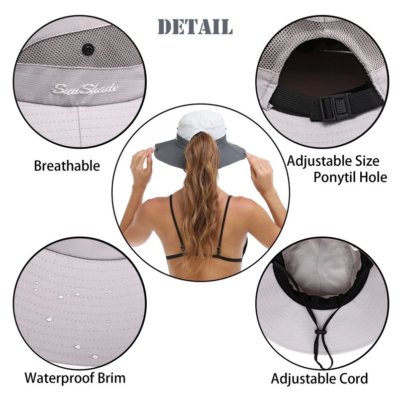 Diseño cuidadoso: sombreros de sol para mujer, botones en ambos lados del sombrero de cubo pueden cambiar el estilo para más experiencia; la parte posterior del sombrero está diseñada con agujero para cola de caballo, que proporciona muchas comodidades para las mujeres con cola de caballo larga o moño, puedes llevar fácilmente tu cabello perforado y mantenido alejado del cuello, ya no es una restricción para aquellos que trabajan al aire libre o mujeres que aman los deportes al aire libre; botones en los lados del sombrero de cubo puede cambiar el estilo para más experiencia.