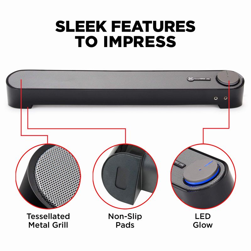 Sonido elegante para tu computadora: el altavoz UBR utiliza conexiones por cable para compatibilidad universal y cuenta con un diseño de barra de sonido de perfil bajo para liberar espacio en el escritorio y reducir el desorden de cables