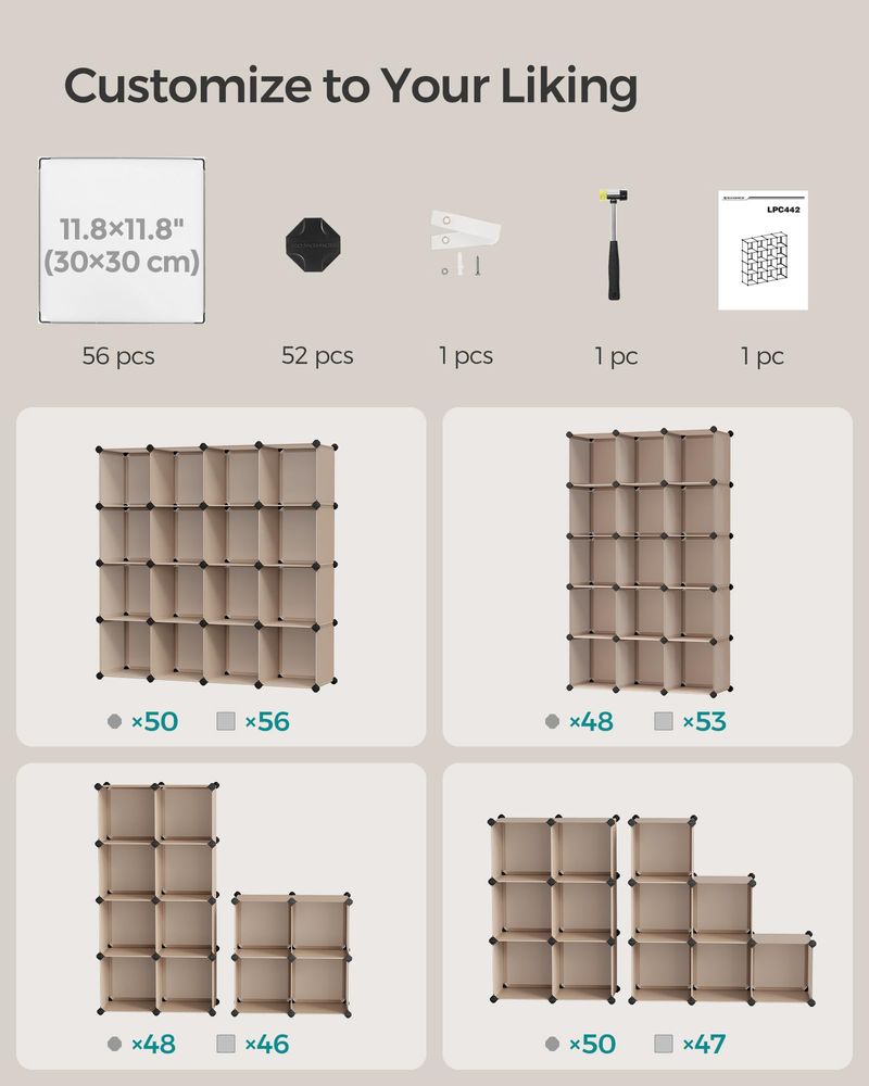 Fácil de montar: la estructura modular del organizador de plástico es fácil y rápida de apilar, y puedes combinar los estantes en diferentes formas para que se adapten a tu espacio. Incluimos un martillo de goma para que puedas montarlos por ti mismo.