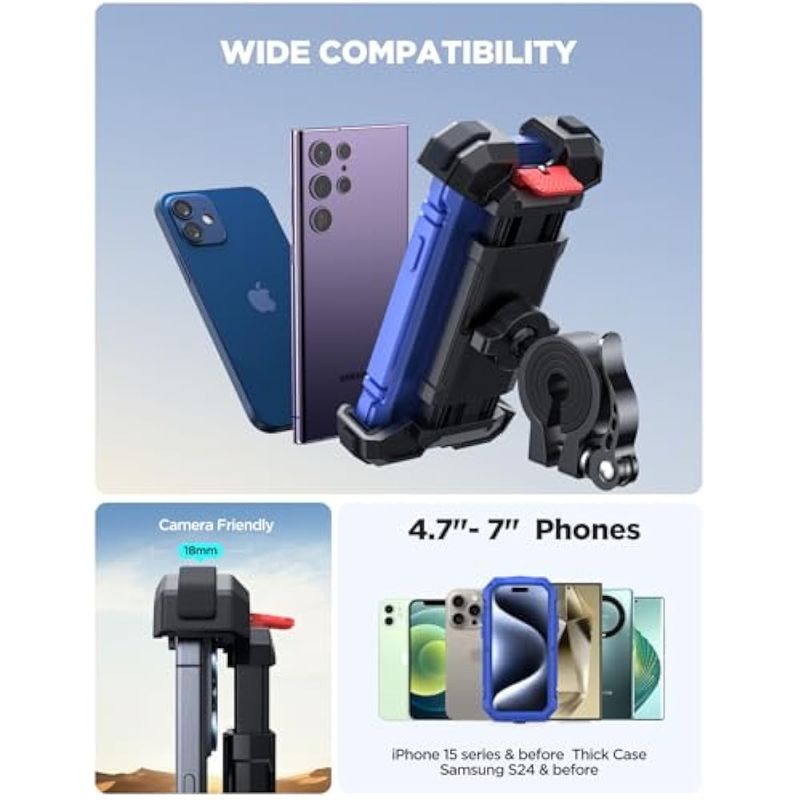 Amplia compatibilidad para bicicletamotocicletabicicletascooter: el soporte de teléfono normal para bicicleta en el mercado solo es compatible con teléfonos de hasta 6.8 pulgadas, pero el soporte universal de JOYROOM para teléfono celular de motocicleta puede adaptarse a teléfonos de 4.7 a 7 pulgadas con fundas gruesas, como iPhone 16 Pro max1514131211, Samsung S24S23S23S23S23. 23+s2 2 y más. El grosor máximo de la abrazadera de montaje para teléfono de motocicleta puede sostener tu teléfono con una funda gruesa ?0.71 pulgadas. Al mismo tiempo, nuestro soporte de teléfono para bicicleta es compatible con manillares de 0.6 a 1.574 pulgadas, por lo que puedes usarlo para cuatrimotos, scooters, cochecitos, bicicletas eléctricas. Fácil de usar: