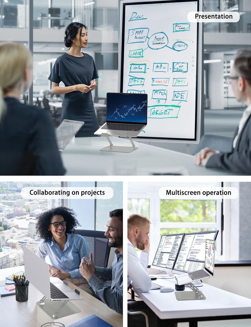 Ajustable y plegable: el soporte ajustable para laptop hace que sea más ergonómico, se puede ajustar libremente en altura y ángulo para satisfacer cualquier necesidad de múltiples ángulos de visión. El soporte con diseño plegable es fácil de transportar y fácil de almacenar, haciendo que tu escritorio de oficina esté limpio.