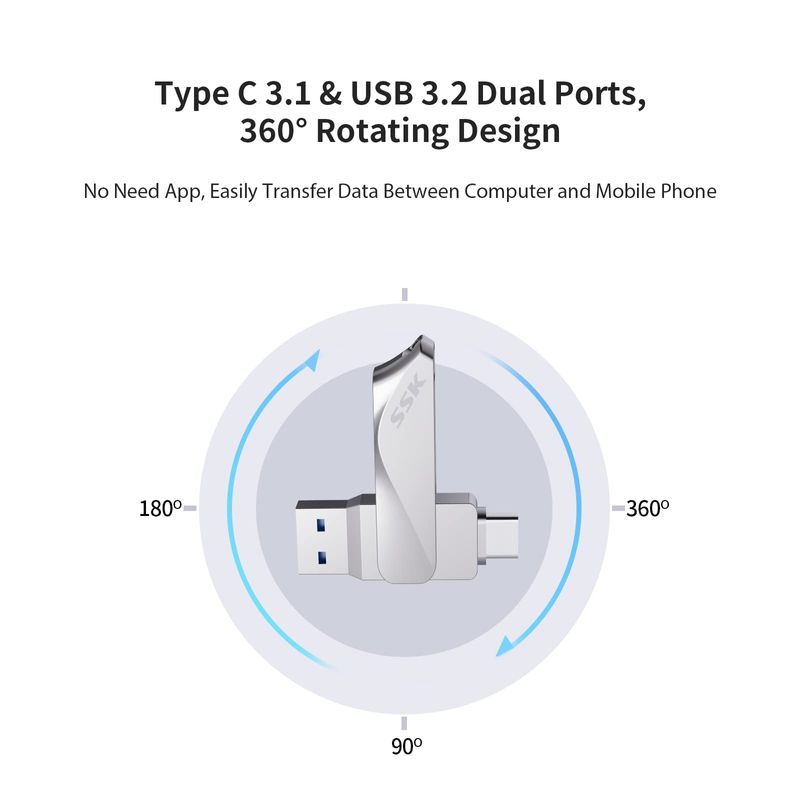 Velocidad de transferencia más rápida: SSK USB 3.2 doble velocidad de lectura de hasta 150 MBs. La velocidad de escritura es estable hasta 100 MBs, es 4 veces más rápida que las memorias USB 2.0 de almacenamiento externo. La unidad móvil de doble conector photostick para datos de almacenamiento externo USB del teléfono le permite transferir archivos y videos entre smartphonetableta y computadora de manera más conveniente. La unidad de salto preferida para teléfonos Android permite mover rápidamente imágenes o videos en todos los dispositivos USB tipo C.