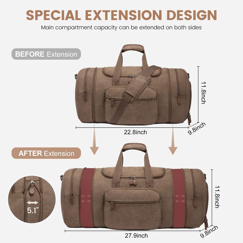?Diseño extensible y artesanía fina?: 22 pulgadas de largo x 9.8 pulgadas de ancho x 11.8 pulgadas de alto. Tira hacia abajo de 2 cremalleras laterales para extender la bolsa a 26 pulgadas de largo. Estas bolsas de viaje para hombre vienen con asas redondeadas cosidas y correa de hombro acolchada ajustable y extraíble. Tiene 3 formas de transporte: sostener en la mano, llevar en el hombro o cruzado. 4 cojines de plástico de alta calidad en la parte inferior para hacer que la bolsa sea resistente a la suciedad.
