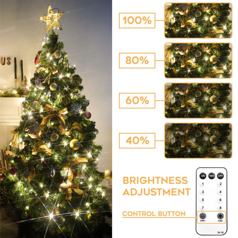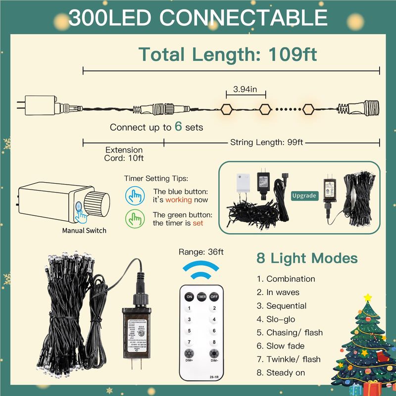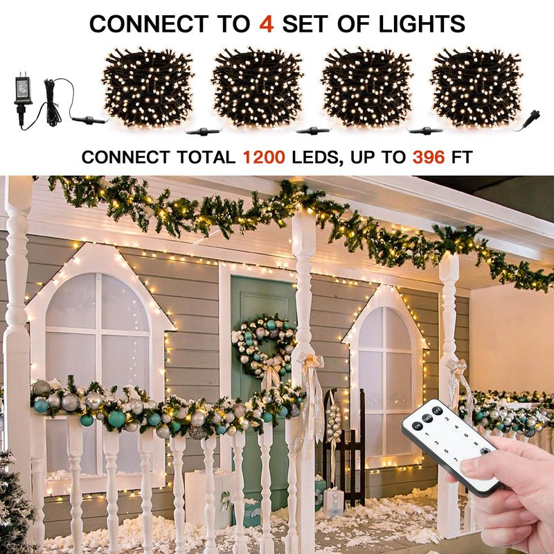 Conectable de extremo a extremo: las luces navideñas se pueden conectar a 6 juegos de luces, un total de 1200 LED. Y todas las luces se pueden controlar con 1 control remoto. Por lo tanto, si quieres decorar una espectacular decoración navideña al aire libre, estas luces blancas de Navidad conectables serán tu primera opción. Se puede utilizar para cercas de patio, grandes árboles de Navidad, terrazas, arbustos y porches. También se puede decorar con marcos de puertas, escaleras, chimenea, etc.