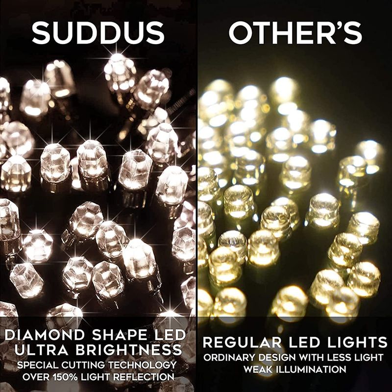 Luces navideñas con forma de diamante: la versión mejorada de SUDDUS de la cadena de 200 luces LED cuenta con tecnología de corte de precisión y formas de diamante. Las luces de Navidad emiten una luz súper brillante y suave desde cualquier ángulo. Además, cuenta con alambre negro, lo que hace que estas luces LED de Navidad se puedan ocultar bien en los árboles de Navidad verdes y arbustos. Las luces brillantes dan detalles llamativos en el patio.