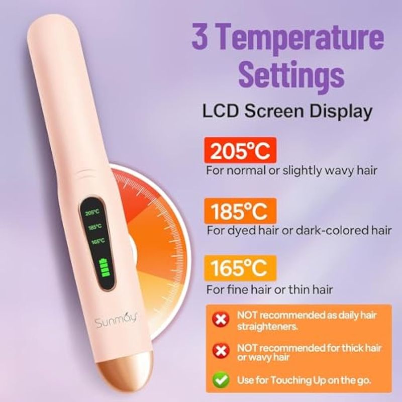 ?Plancha inalámbrica portátil?La función inalámbrica significa que puedes usarla en cualquier lugar sin preocuparte por encontrar una toma de corriente o lidiar con un cable enredado. Puedes llevarlo contigo en el automóvil, a la oficina o a cualquier lugar donde estés y hacer un retoque. Cabe fácilmente en tu bolso o bolsa de gimnasio. No se recomienda para alisador diario, solo para retocar el cabello y no se recomienda para cabello grueso y largo.