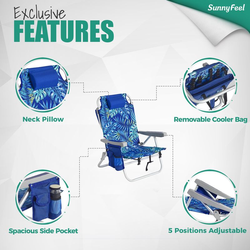 SUNNYFEEL SILLA DE PLAYA BAJA DE 5 POSICIONES PLANA, MOCHILA PLEGABLE PORTáTIL RESISTENTE CON BOLSA REFRIGERADORA, PORTAVASOS PARA EXTERIORES, CéSPED, VIAJE, PICNIC, PESCA, SILLA DE CAMPING PLEGABLE (AZUL NUEVO)