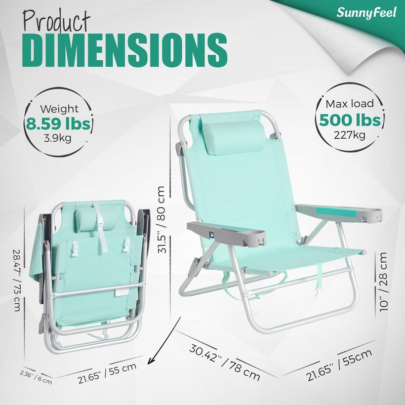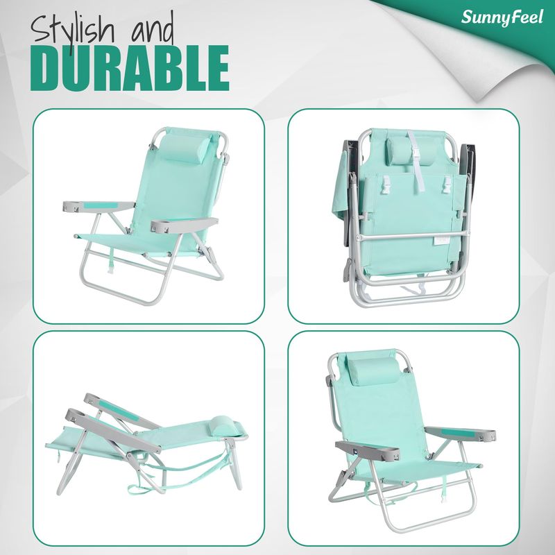 SUNNYFEEL SILLA DE PLAYA BAJA DE 5 POSICIONES PLANA, MOCHILA PLEGABLE PORTáTIL RESISTENTE CON BOLSA REFRIGERADORA, PORTAVASOS PARA EXTERIORES, CéSPED, VIAJE, PICNIC, PESCA, SILLA DE CAMPING PLEGABLE (AZUL NUEVO)