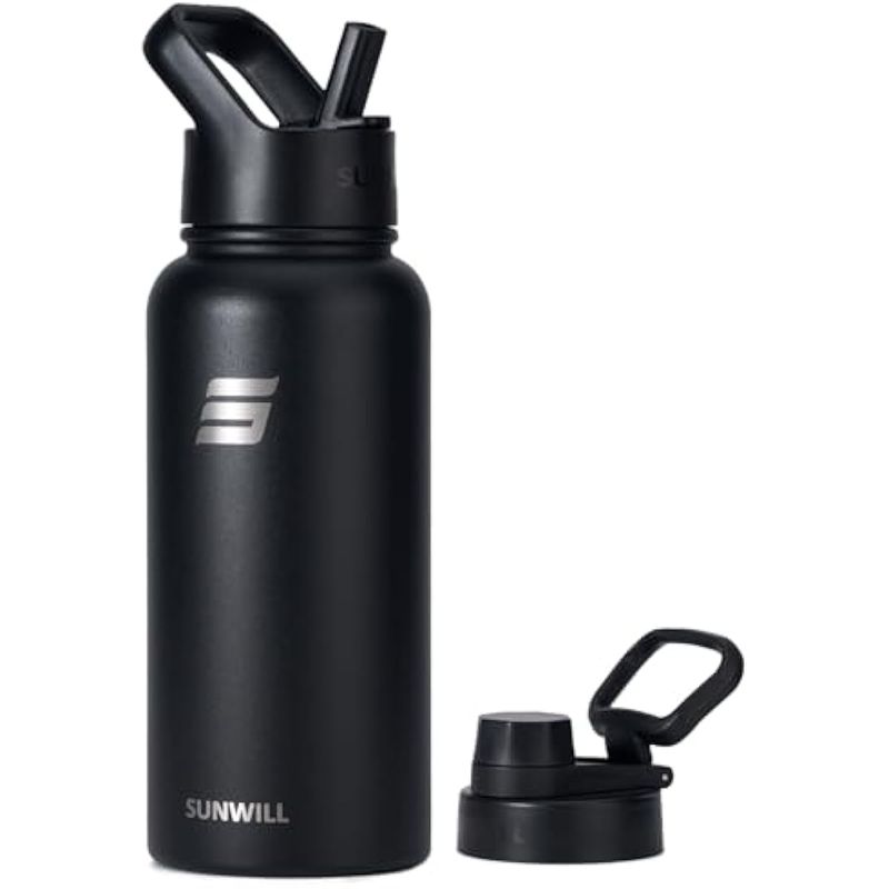 2 tapas incluidas, a prueba de fugas y libre de BPA: la botella de agua aislada SUNWILL viene con una tapa con popote, una tapa para beber y dos popotes. Ambos son a prueba de fugas y libres de BPA. La bebida saludable está asegurada, mango de diseño ergonómico para un fácil transporte, la mejor botella de viaje de hidratación para tus aventuras al aire libre, gimnasio, senderismo, campamento y escalada.