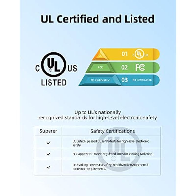 Temores de seguridad superiores: el cargador USB tipo C de Superer para portátil LG Gram está equipado con más de 6 mejoras de seguridad, como protección de alto voltaje, protección contra sobretemperatura y protección contra cortocircuitos. Este cargador también está listado y certificado por ULCEFCC. comprueba la marca certificada y los números UL únicos impresos en la parte posterior del adaptador