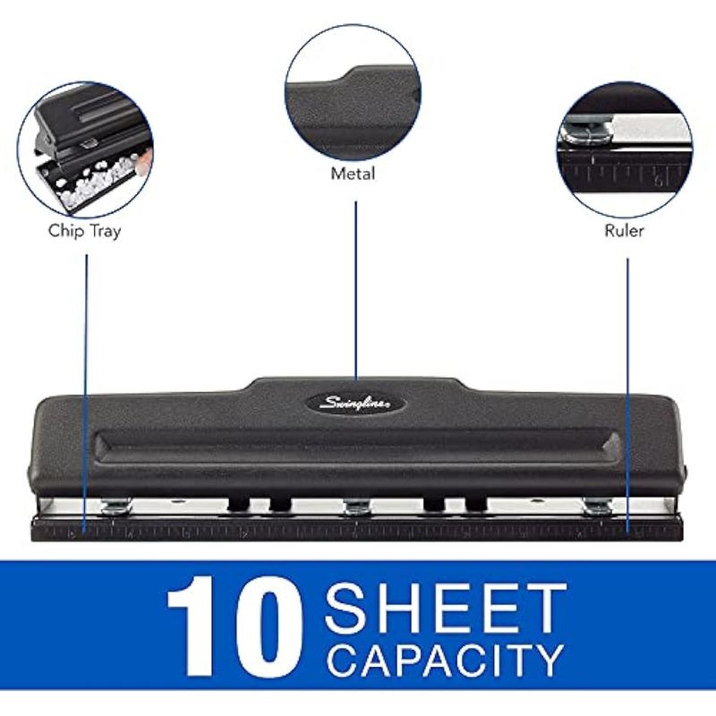 Swingline Perforadora de 3 agujeros, capacidad para 10 hojas, perforadora de tres agujeros, 3