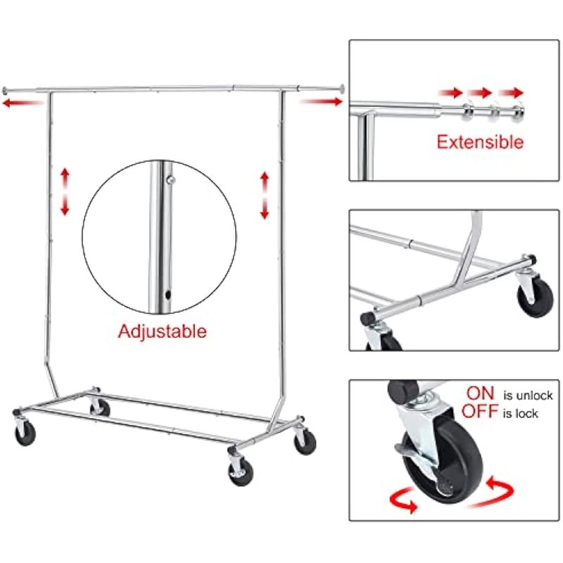 Perchero extensible y ajustable: la barra horizontal de este perchero resistente se puede extender de 50.8 a 65.8 pulgadas y la altura vertical se puede ajustar de 57 a 62 pulgadas. Puedes ajustar la longitud y la altura del perchero plegable para satisfacer tus necesidades de espacio.