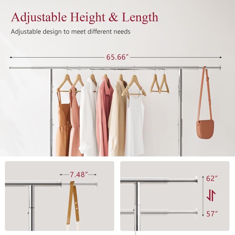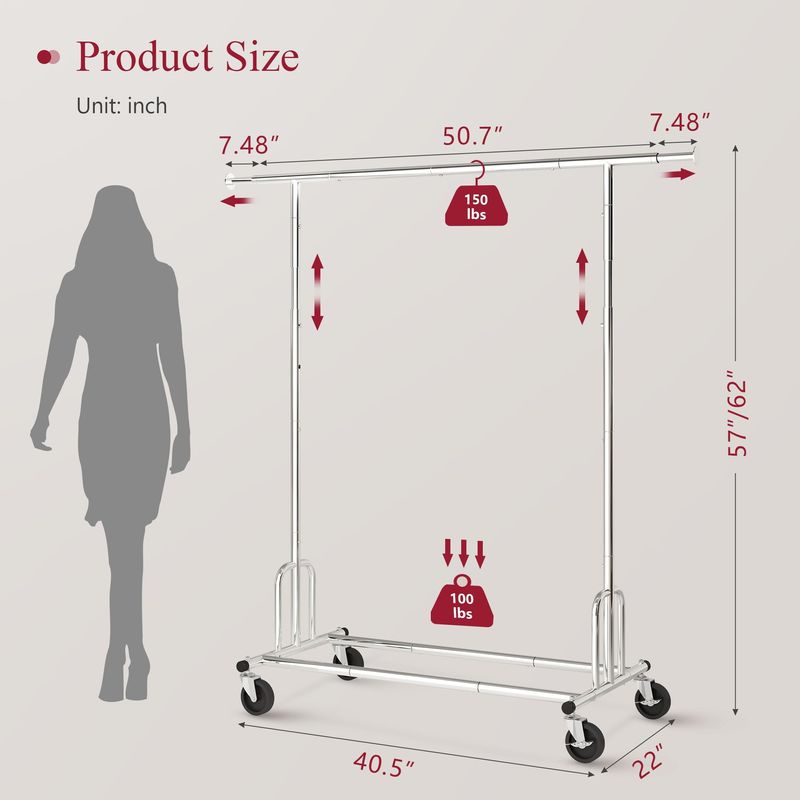 Perchero extensible y ajustable: la barra horizontal de este perchero resistente se puede extender de 50.8 a 65.8 pulgadas y la altura vertical se puede ajustar de 57 a 62 pulgadas. Puedes ajustar la longitud y la altura del perchero plegable para satisfacer tus necesidades de espacio.