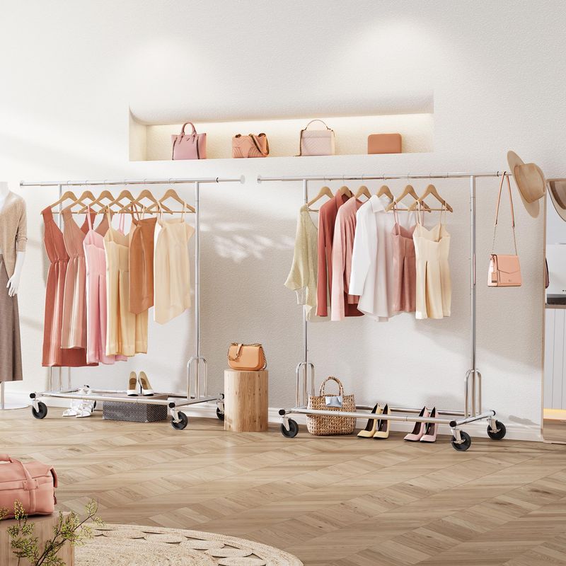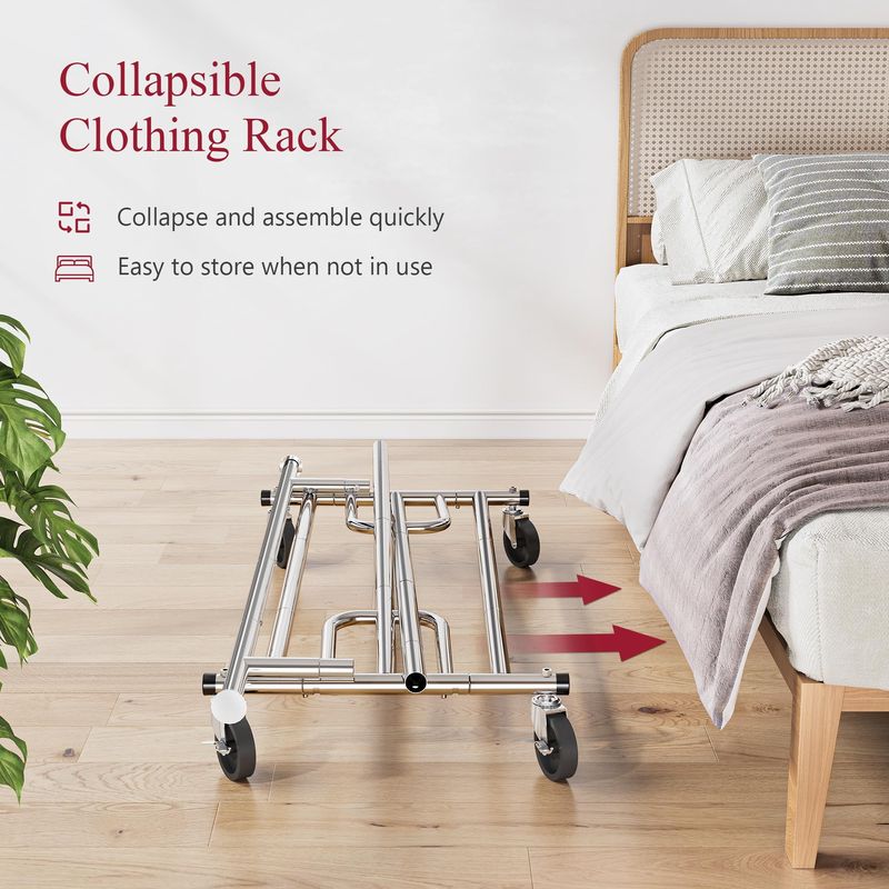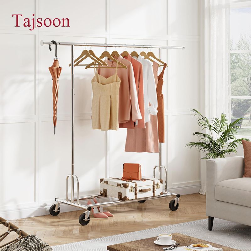 TAJSOON PERCHERO DE ROPA RESISTENTE CON RUEDAS Y BARRA EXTENSIBLE, PERCHERO PLEGABLE PARA ROPA CON CAPACIDAD MáXIMA DE 300 LIBRAS, ESTANTE INDUSTRIAL CON ESTANTE INFERIOR, CROMADO