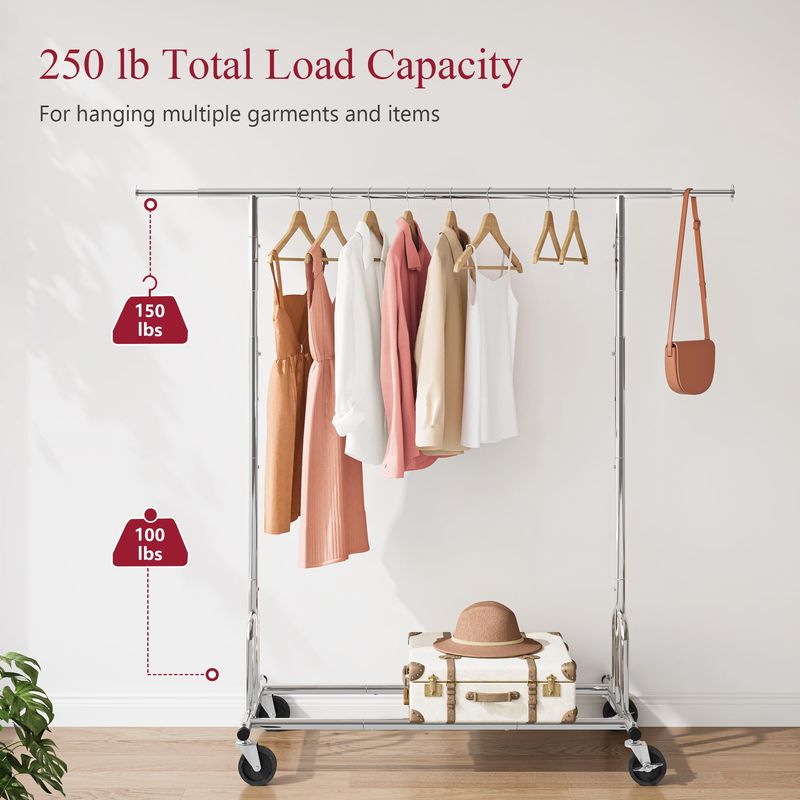 Capacidad de carga de 250 libras: hecho de metal de alta calidad y poste grueso, el perchero plegable soporta hasta 250 libras 150 libras en las barras colgantes y 100 libras en el estante inferior. Y todo el perchero plegable con revestimiento cromado duradero tiene como objetivo mejorar la protección contra el agua, el óxido, la corrosión y los arañazos.