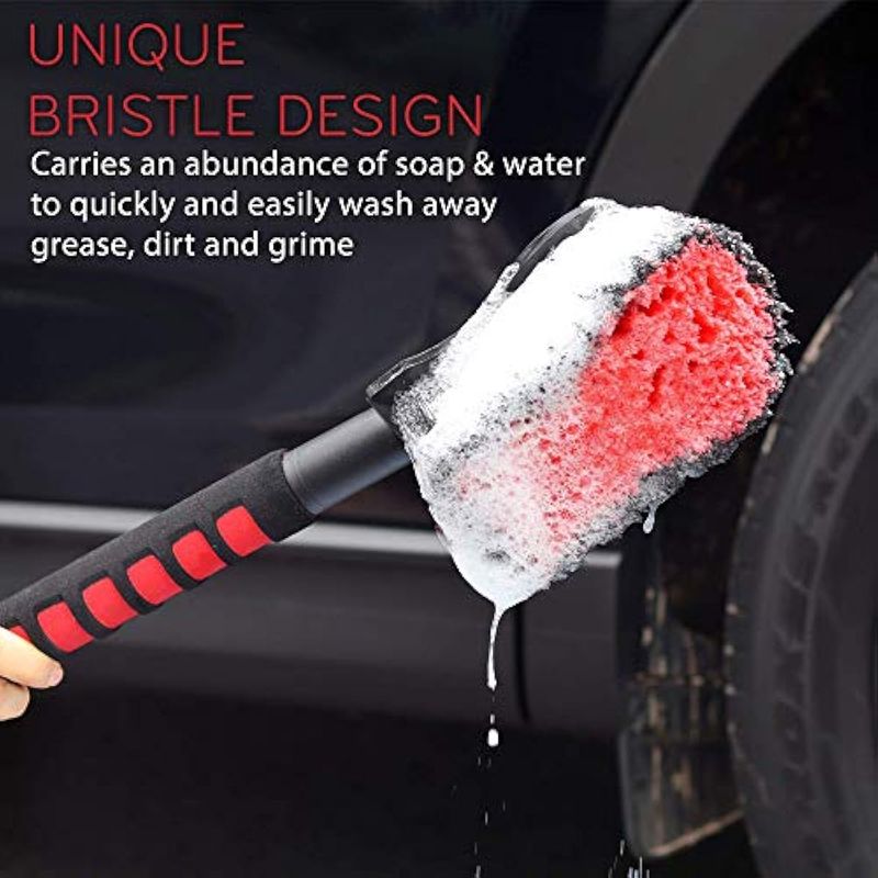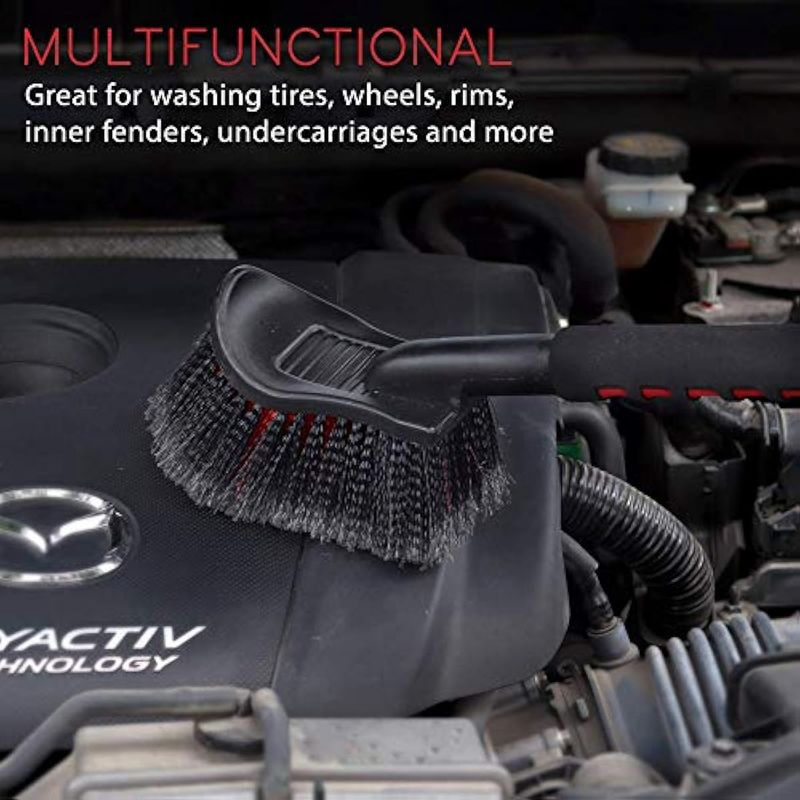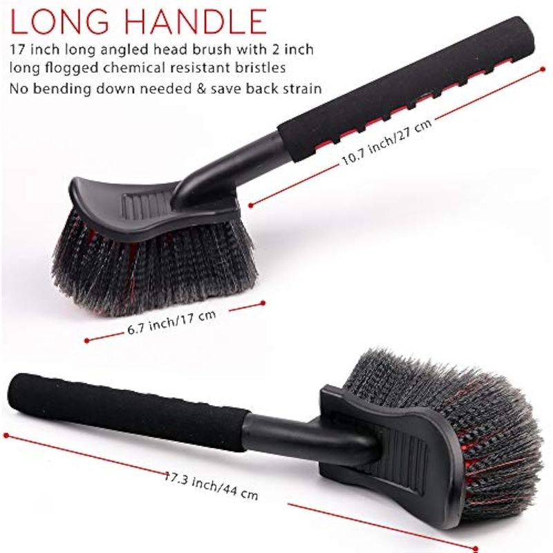 MULTIFUNCIONAL: El cepillo extra largo para ruedas y neumáticos es perfecto para limpiar ruedas y revestimientos de guardabarros, también muy adecuado para limpiar todas las superficies rugosas del vehículo. Limpia fácilmente las camas grandes de camiones, remolques, revestimientos de RV, trenes de rodaje de camiones elevados, protectores de escobillas, rejillas de radiador y bahías del motor. Las posibilidades son ilimitadas.