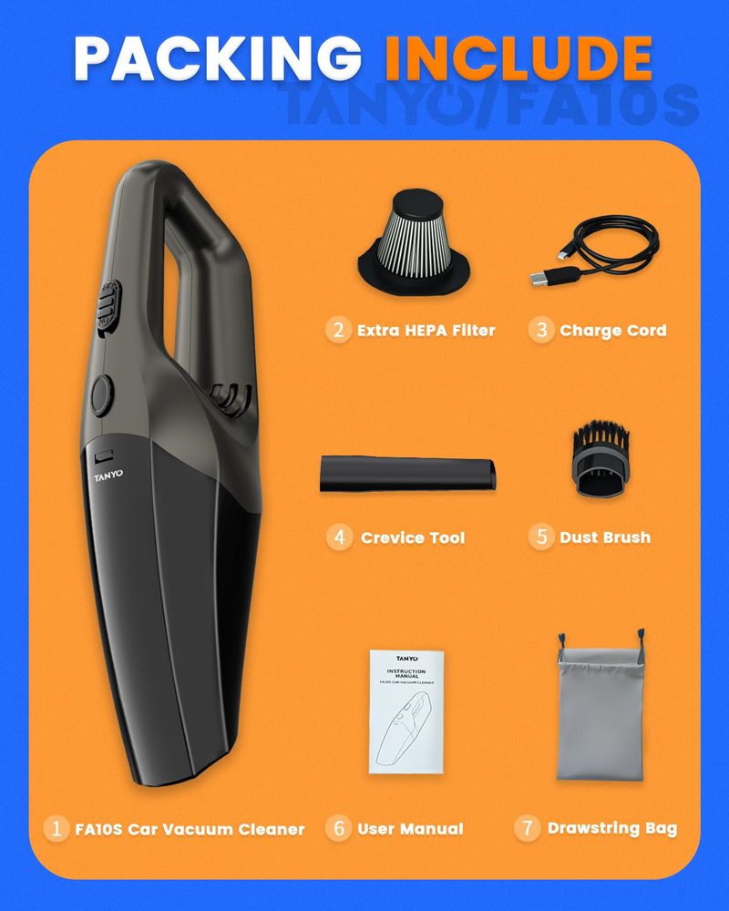 ACCESORIOS DE EMBALAJE Y SOPORTE: 1 aspiradora de coche FA10S de grado profesional, 1 herramienta para grietas, 1 cepillo para polvo, 2 filtros HEPA de acero inoxidable lavables, 1 bolsa con cordón, 1 cable de carga, 1 manual de usuario idioma español no garantizado. Si tienes alguna pregunta, no dudes en ponerte en contacto con el equipo de servicio al cliente, te ayudaremos.
