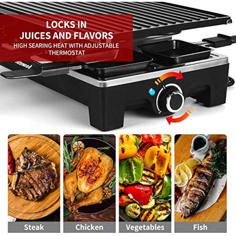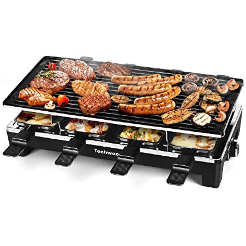 TECHWOOD - RACLETTE DE MESA, PARRILLA PARA BARBACOA COREANA ELéCTRICA DE INTERIOR, PLACA DE PARRILLA ANTIADHERENTE 2 EN 1 EXTRAíBLE, 1500W DE CALENTAMIENTO RáPIDO CON 8 SARTENES PARA FUNDIR QUESO, IDEAL PARA FIESTAS Y DIVERSIóN FAMILIAR
