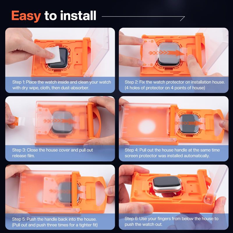 Muy fácil de instalar: simplemente coloca el protector de pantalla de Apple Watch en la casa de instalación, tira y empuja, y la película se fijará automáticamente al Apple Watch, 0 fallas y 0 burbujas. Además, hay un video de instalación en nuestra página de producto, sigue la operación de video, incluso si eres un novato, tendrás 100 éxito