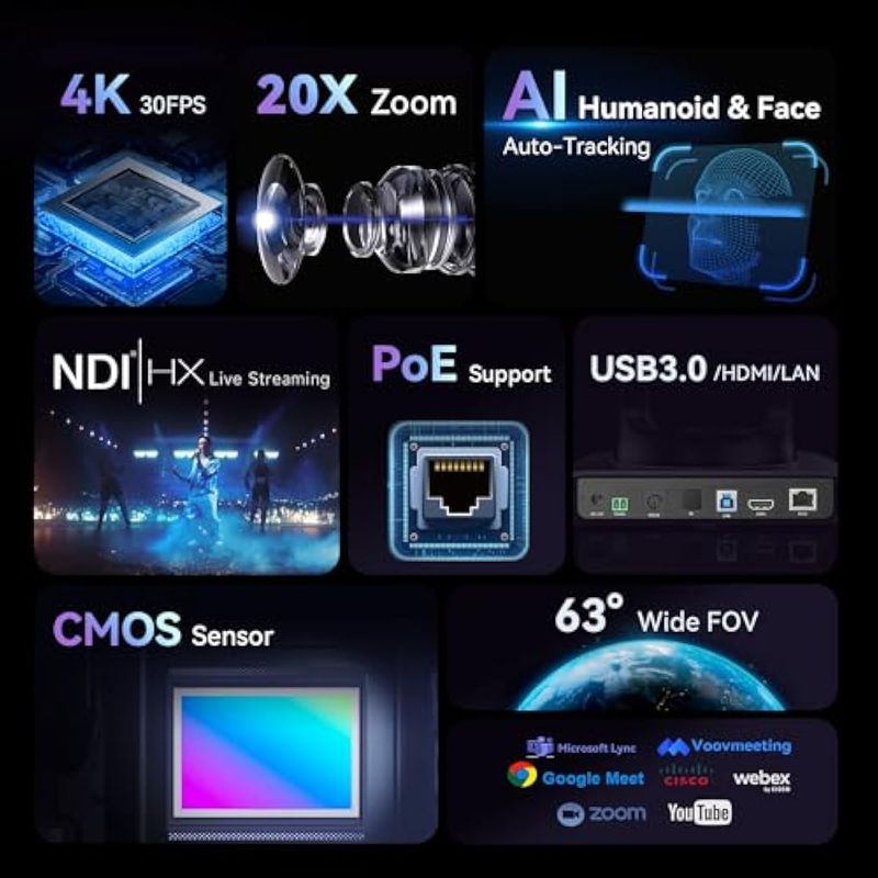 INFORMÁTICAACCESORIOS DE INFORMATICACAMARAS WEBTenveo Cámara NDI PTZ Church Streaming 1080P 60FPS con zoom óptico 20X Lente gran angular