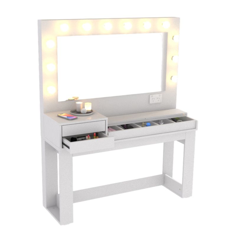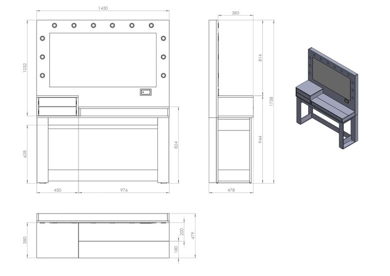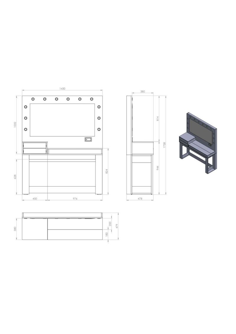 Eleva tu espacio de belleza con el Tocador Maquillador Tipo Hollywood, una pieza de diseño único que fusiona la sofisticación de un tocador profesional con la practicidad de un mueble moderno y funcional. Ideal para quienes buscan un lugar exclusivo y bien organizado para su rutina de maquillaje. Calidad y Durabilidad: Este tocador está meticulosamente fabricado en melamina MDP y MDF de 18 mm, asegurando una estructura robusta y una larga vida útil. Su melamina texturada no solo le confiere una apariencia elegante y contemporánea, sino que también ofrece una resistencia superior a arañazos y desgaste diario. Las terminaciones premium garantizan un acabado impecable en cada detalle. Organización Inteligente: Mantén tus productos de belleza ordenados sin esfuerzo. El tocador cuenta con 2 amplios cajones equipados con correderas telescópicas, que permiten una apertura suave y completa, facilitando el acceso a todo su contenido. Además, su tapa rebatible revela 5 espacios de guardado internos, perfectos para organizar cosméticos, joyas y accesorios pequeños, manteniéndolos ocultos y protegidos cuando no los usas. Iluminación Profesional: Disfruta de una iluminación óptima para cada aplicación de maquillaje gracias a sus 12 lámparas LED incluidas. Estas luces, estratégicamente ubicadas, simulan la iluminación de un set de Hollywood, eliminando sombras y ofreciendo una visibilidad perfecta para un acabado impecable. Conectividad del Futuro: Incorpora un Módulo Smart que lleva la funcionalidad a otro nivel. Este innovador sistema incluye toma corrientes para tus herramientas de peinado, un puerto USB para cargar tus dispositivos y un touch de encendido para las luces. Lo más destacado es su capacidad de vincularse con una aplicación móvil y con Alexa, permitiéndote controlar la iluminación y otras funciones de forma remota y con comandos de voz, adaptándose a tu estilo de vida conectado. Funciona con conexión directa a 220 volts. Diseño Exclusivo y Funcional: Con unas medidas de 143 cm x 47.8 cm x 175 cm, este tocador ofrece un amplio espacio de trabajo sin sacrificar la estética. Su diseño único, exclusivo, original y funcional lo convierte en el centro de atención de cualquier habitación, combinando belleza y utilidad de manera excepcional. El Tocador Maquillador Tipo Hollywood