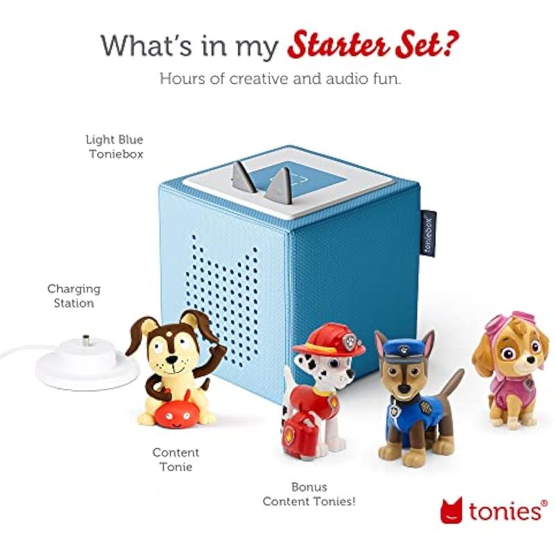 El paquete incluye un Toniebox azul claro, estación de carga, Chase, Skye, Marshall y Playtime Puppy Tonies. Tonies adicional se puede comprar por separado.