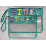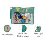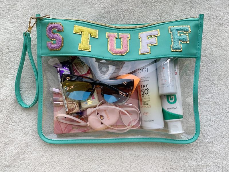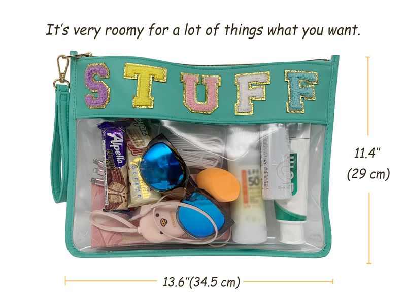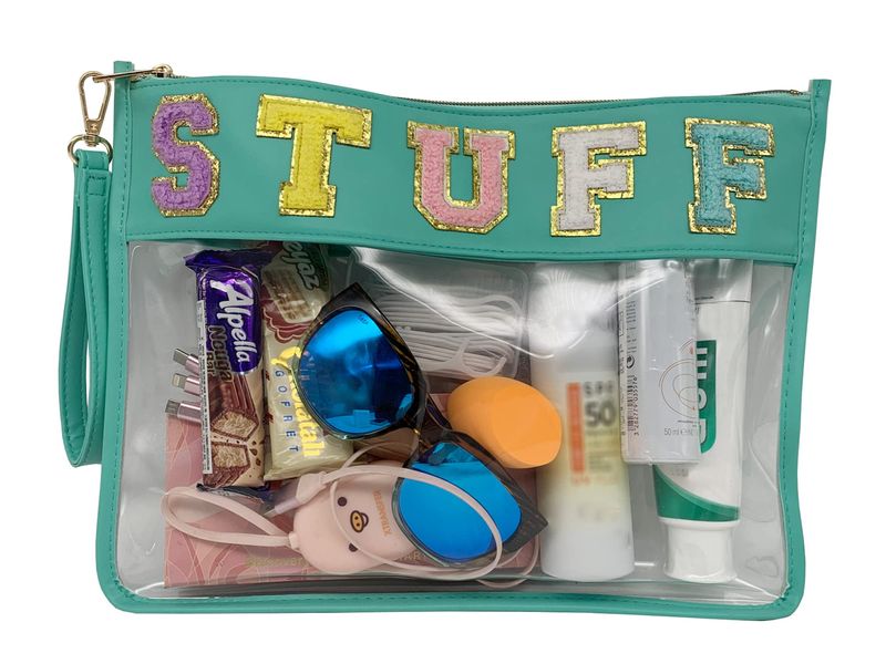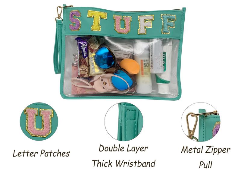 TOPTTANBO BOLSA TRANSPARENTE DE CHENILLA CON LETRAS, MULTIUSOS, TRANSPARENTE, IMPERMEABLE, PARA APERITIVOS, MAQUILLAJE, CON CORREA PARA LA MUñECA