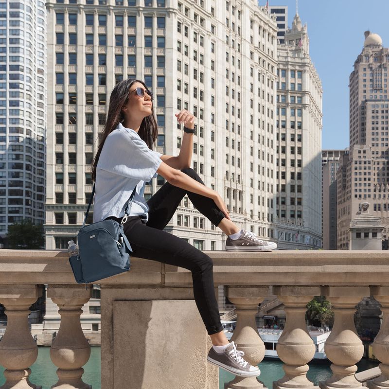 Protege tus pertenencias de carteristas y ladrones con la bolsa de viaje antirrobo de Travelon. Con estructura de eslabones de cadena oculta, a prueba de cortes, y una correa de hombro ajustable, reforzada con cable y a prueba de cortes. El espacioso compartimento principal cuenta con una cremallera de bloqueo y bolsillos para organización. El organizador trasero incluye ranuras para tarjetas de crédito y bolsillos para documentos de viaje. El bolsillo de expansión con cremallera sostiene una cámara, botella de agua o lentes de sol.