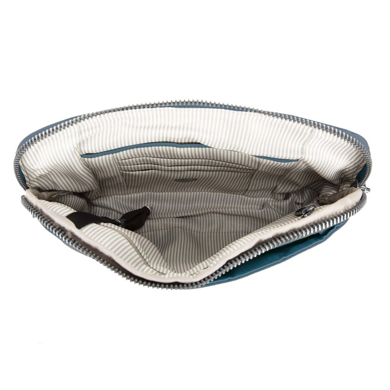 El compartimento principal de bloqueo tiene ranuras para pasaporte y tarjetas protegidas por RFID, y un bolsillo de pared con cremallera y clip para llaves atado con luz LED