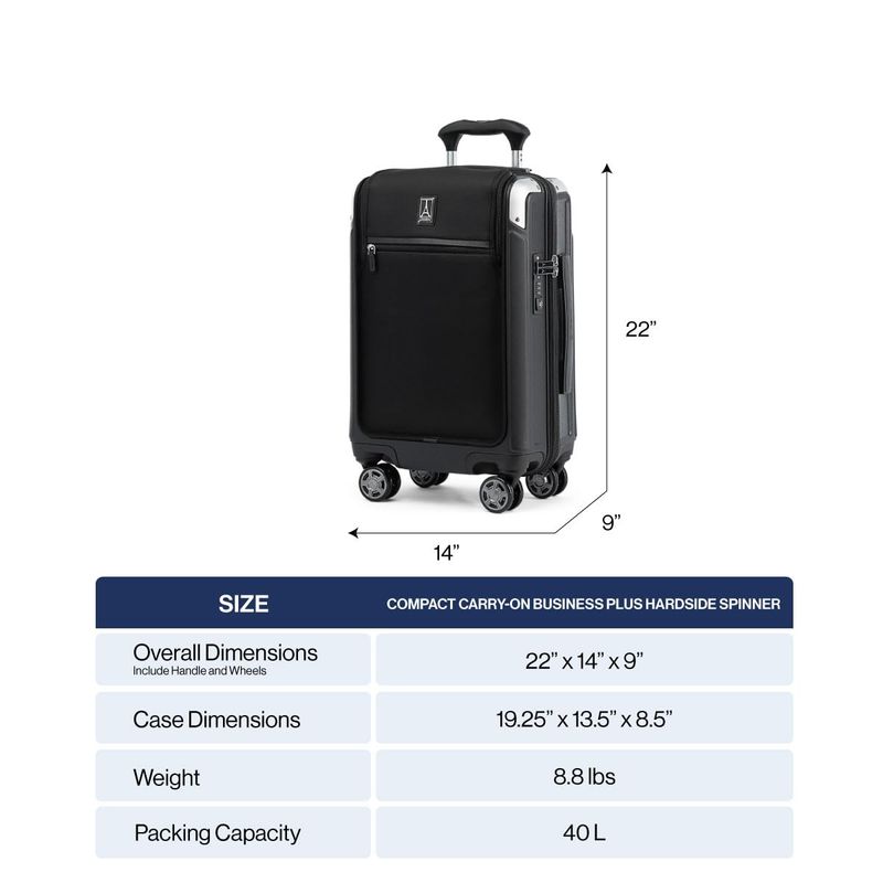 Equipaje de mano con ruedas giratorias Dimensiones totales incluye ruedas y asas: H: 23 pulgadas. Ancho: 14.5 pulgadas. D: 9.5 in. Dimensiones de la caja: H: 20.25 in. Ancho: 13.5 pulgadas. D: 9.25 in. Peso: 8.1 lbs. Cobertura limitada de por vida más una promesa de acompañante confiable, que cubre el costo de reparación por daños de aerolíneas u otra aerolínea común durante los primeros cinco años de garantía de por vida. Aplicable cuando se compra como nuevo y después del registro.