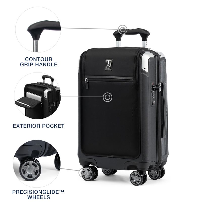 Elegante, ultra duradero y cargado de características, el equipaje de mano Platinum® Elite expandible ofrece todas las comodidades modernas que deseas en un sofisticado equipaje de mano que se adapta cuando necesitas más espacio de embalaje. Esta maleta de viaje te permite alimentar tus dispositivos electrónicos sobre la marcha utilizando puertos USB A y C externos con capacidades de carga rápida y un bolsillo dedicado para batería de acceso externo patente pendiente que proporciona almacenamiento compatible con la FAA para tu banco de energía. El equipaje de mano con ruedas giratorias está probado para caber en los contenedores superiores de la mayoría de las principales aerolíneas nacionales, este equipaje de mano también ofrece una opción de expansión con cremallera de 2 pulgadas para aumentar la capacidad de embalaje cuando sea necesario. Diseñado para un gran aspecto y máxima resistencia, este equipaje rígido está fabricado de forma duradera con una carcasa de policarbonato 100 ultra fuerte, fácil de limpiar que se flexiona al impacto para evitar grietas y mantener el contenido protegido, mientras que su atractivo acabado texturizado ayuda a reducir la visibilidad de rasguños o arañazos. El ribete de cuero genuino añade sofisticación, y la distintiva armadura de esquina de aluminio protege las zonas de alto impacto con estilo. La cerradura integrada aprobada por la TSA permite a las autoridades un acceso seguro para la inspección cuando sea necesario. Empaca con facilidad dentro del diseño de concha con dos paneles divisores con cremallera que mantienen el contenido separado y almacenado de forma segura en su lugar. Este equipaje de mano duro tiene múltiples bolsillos para accesorios que proporcionan una organización integrada, y un práctico bolsillo resistente al agua guarda artículos húmedos o artículos de aseo personal. En movimiento, esta belleza compacta vuela con un control preciso y un giro sin esfuerzo, gracias al exclusivo sistema PrecisionGlide™ de Travelpro®, ocho ruedas giratorias autoalineables MagnaTrac® lideradas por un mango PowerScope Lite resistente y ajustable de cuatro paradas con cómodo agarre de contorno. El equipaje duro con ruedas giratorias está respaldado por nuestra garantía limitada de por vida con la promesa de compañero de confianza que incluso cubre los daños causados por las aerolíneas u otros transportistas comunes durante los primeros cinco años de garantía de por vida.