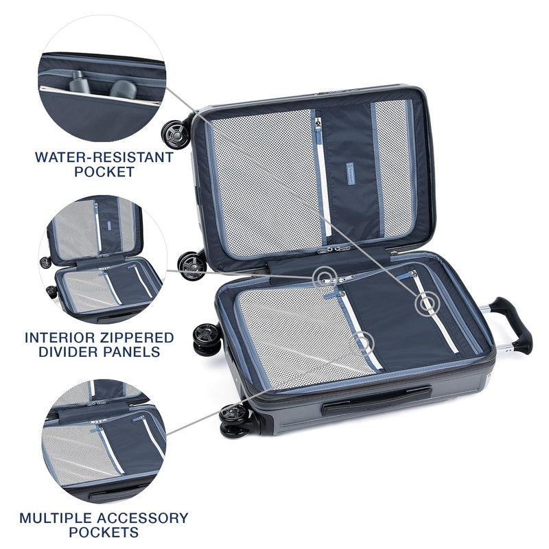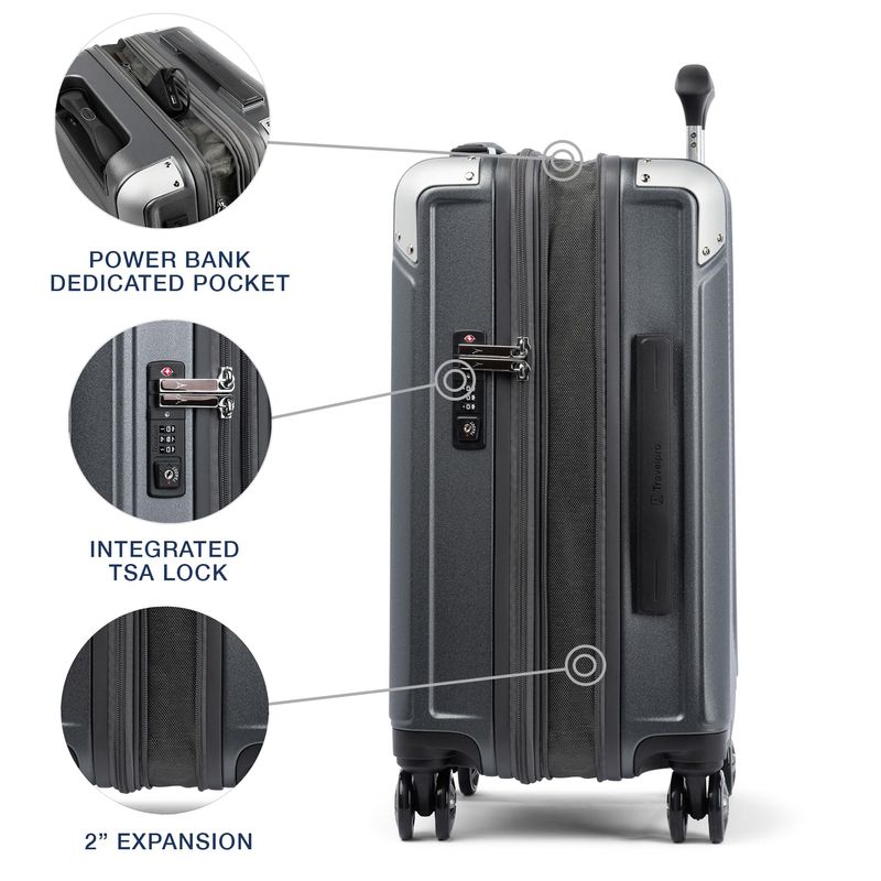 Elegante, ultra duradero y cargado de características, el equipaje de mano Platinum® Elite expandible ofrece todas las comodidades modernas que deseas en un sofisticado equipaje de mano que se adapta cuando necesitas más espacio de embalaje. Esta maleta de viaje te permite alimentar tus dispositivos electrónicos sobre la marcha utilizando puertos USB A y C externos con capacidades de carga rápida y un bolsillo dedicado para batería de acceso externo patente pendiente que proporciona almacenamiento compatible con la FAA para tu banco de energía. El equipaje de mano con ruedas giratorias está probado para caber en los contenedores superiores de la mayoría de las principales aerolíneas nacionales, este equipaje de mano también ofrece una opción de expansión con cremallera de 2 pulgadas para aumentar la capacidad de embalaje cuando sea necesario. Diseñado para un gran aspecto y máxima resistencia, este equipaje rígido está fabricado de forma duradera con una carcasa de policarbonato 100 ultra fuerte, fácil de limpiar que se flexiona al impacto para evitar grietas y mantener el contenido protegido, mientras que su atractivo acabado texturizado ayuda a reducir la visibilidad de rasguños o arañazos. El ribete de cuero genuino añade sofisticación, y la distintiva armadura de esquina de aluminio protege las zonas de alto impacto con estilo. La cerradura integrada aprobada por la TSA permite a las autoridades un acceso seguro para la inspección cuando sea necesario. Empaca con facilidad dentro del diseño de concha con dos paneles divisores con cremallera que mantienen el contenido separado y almacenado de forma segura en su lugar. Este equipaje de mano duro tiene múltiples bolsillos para accesorios que proporcionan una organización integrada, y un práctico bolsillo resistente al agua guarda artículos húmedos o artículos de aseo personal. En movimiento, esta belleza compacta vuela con un control preciso y un giro sin esfuerzo, gracias al exclusivo sistema PrecisionGlide™ de Travelpro®, ocho ruedas giratorias autoalineables MagnaTrac® lideradas por un mango PowerScope Lite resistente y ajustable de cuatro paradas con cómodo agarre de contorno. El equipaje duro con ruedas giratorias está respaldado por nuestra garantía limitada de por vida con la promesa de compañero de confianza que incluso cubre los daños causados por las aerolíneas u otros transportistas comunes durante los primeros cinco años de garantía de por vida.