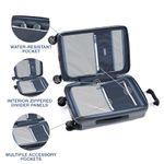 El equipaje de mano de 21 pulgadas tiene paneles divisores interiores con cremallera que mantienen el contenido organizado, separado y asegurado en su lugar. El bolsillo interior resistente al agua proporciona versatilidad de embalaje para artículos húmedos o artículos de tocador.