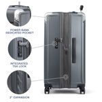La maleta de mano tiene puertos USB A y C externos con capacidades de carga rápida que te permiten alimentar tus dispositivos electrónicos sobre la marcha y el bolsillo externo de la batería pendiente de patente está oculto dentro de la función de expansión para un fácil acceso y cumplimiento de la FAA batería externa no incluida. El equipaje rígido tiene una cerradura incorporada que permite a las autoridades de la TSA desbloquear y bloquear de forma segura cuando sea necesario. El código de bloqueo predeterminado se establece en 0-0-0.