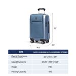 Equipaje de mano con ruedas giratorias Dimensiones totales incluye ruedas y asas: H: 23 pulgadas. Ancho: 14.5 pulgadas. D: 9.5 in. Dimensiones de la caja: H: 20.25 in. Ancho: 13.5 pulgadas. D: 9.25 in. Peso: 8.1 lbs. Cobertura limitada de por vida más una promesa de acompañante confiable, que cubre el costo de reparación por daños de aerolíneas u otra aerolínea común durante los primeros cinco años de garantía de por vida. Aplicable cuando se compra como nuevo y después del registro.