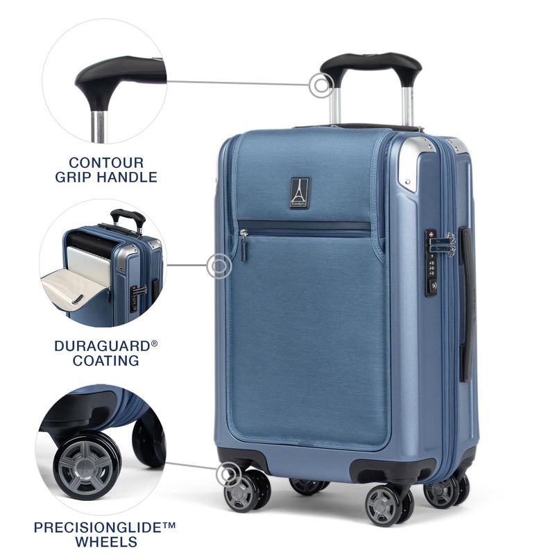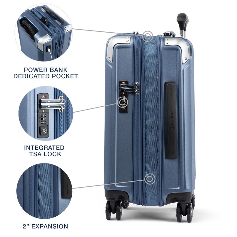 Elegante, ultra duradero y cargado de características, el equipaje de mano Platinum® Elite expandible ofrece todas las comodidades modernas que deseas en un sofisticado equipaje de mano que se adapta cuando necesitas más espacio de embalaje. Esta maleta de viaje te permite alimentar tus dispositivos electrónicos sobre la marcha utilizando puertos USB A y C externos con capacidades de carga rápida y un bolsillo dedicado para batería de acceso externo patente pendiente que proporciona almacenamiento compatible con la FAA para tu banco de energía. El equipaje de mano con ruedas giratorias está probado para caber en los contenedores superiores de la mayoría de las principales aerolíneas nacionales, este equipaje de mano también ofrece una opción de expansión con cremallera de 2 pulgadas para aumentar la capacidad de embalaje cuando sea necesario. Diseñado para un gran aspecto y máxima resistencia, este equipaje rígido está fabricado de forma duradera con una carcasa de policarbonato 100 ultra fuerte, fácil de limpiar que se flexiona al impacto para evitar grietas y mantener el contenido protegido, mientras que su atractivo acabado texturizado ayuda a reducir la visibilidad de rasguños o arañazos. El ribete de cuero genuino añade sofisticación, y la distintiva armadura de esquina de aluminio protege las zonas de alto impacto con estilo. La cerradura integrada aprobada por la TSA permite a las autoridades un acceso seguro para la inspección cuando sea necesario. Empaca con facilidad dentro del diseño de concha con dos paneles divisores con cremallera que mantienen el contenido separado y almacenado de forma segura en su lugar. Este equipaje de mano duro tiene múltiples bolsillos para accesorios que proporcionan una organización integrada, y un práctico bolsillo resistente al agua guarda artículos húmedos o artículos de aseo personal. En movimiento, esta belleza compacta vuela con un control preciso y un giro sin esfuerzo, gracias al exclusivo sistema PrecisionGlide™ de Travelpro®, ocho ruedas giratorias autoalineables MagnaTrac® lideradas por un mango PowerScope Lite resistente y ajustable de cuatro paradas con cómodo agarre de contorno. El equipaje duro con ruedas giratorias está respaldado por nuestra garantía limitada de por vida con la promesa de compañero de confianza que incluso cubre los daños causados por las aerolíneas u otros transportistas comunes durante los primeros cinco años de garantía de por vida.