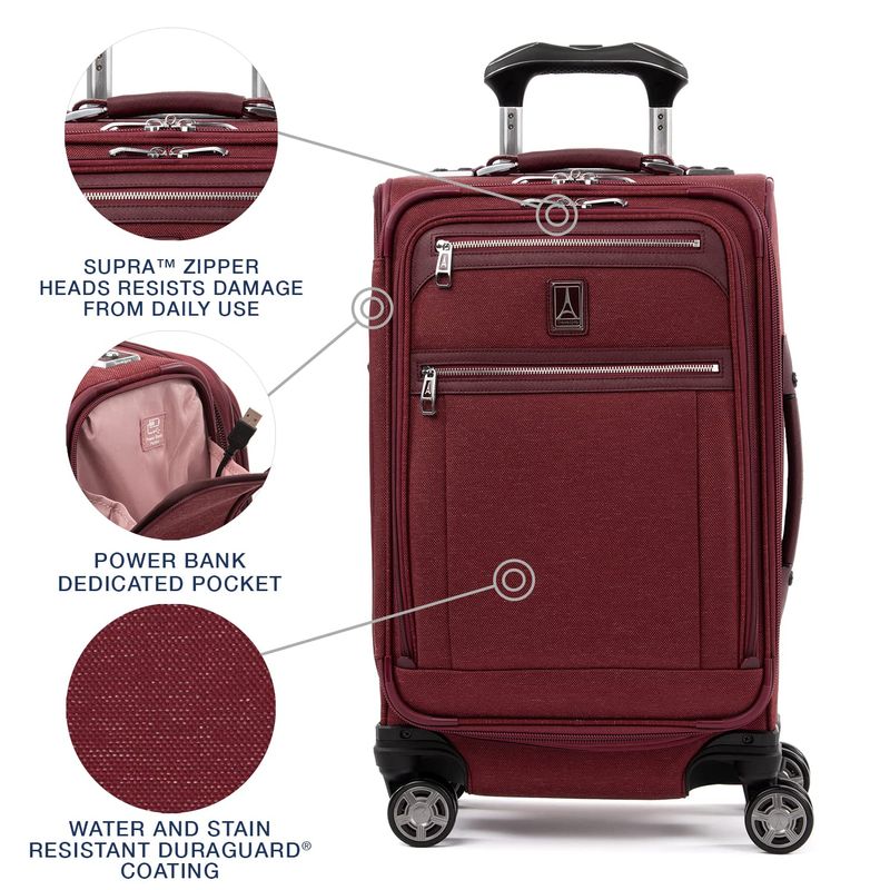 Maximiza tu equipaje de mano con un estilo sofisticado. El spinner de mano expandible de élite platino ofrece una gran forma y función con una expansión resistente a las puntas que ofrece hasta 2 pulgadas más capacidad de embalaje, sistema de amarre de lujo, bolsillos integrados para accesorios y un bolsillo húmedo extraíble de tamaño de cuarto de galón que cumple con la TSA y perfecto para artículos de aseo personal. Además, el traje plegable está diseñado específicamente para acomodar ropa colgante y evitar arrugas. El puerto USB integrado te permite encender sobre la marcha, mientras que un bolsillo dedicado para tu batería de respaldo cumple con las regulaciones de la FAA. Perfecto para viajes de longitud corta a media, este spinner de mano está fabricado con estilo con telas de primera calidad, cuero genuino y cremalleras cromadas. Las características de movilidad de primera línea incluyen el sistema de deslizamiento de precisión con ocho ruedas giratorias magnatrac, autoalineadas de 360 grados guiadas por un mango de extensión PowerScope ajustable con agarre patentado Contour y puntos de contacto de goma para una maniobra cómoda y fácil dondequiera que vayas. Respaldado por nuestro construido para una vida limitada sin preocupaciones.