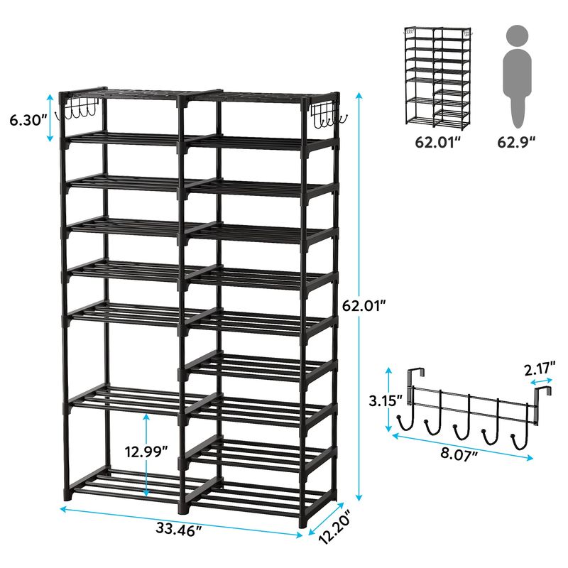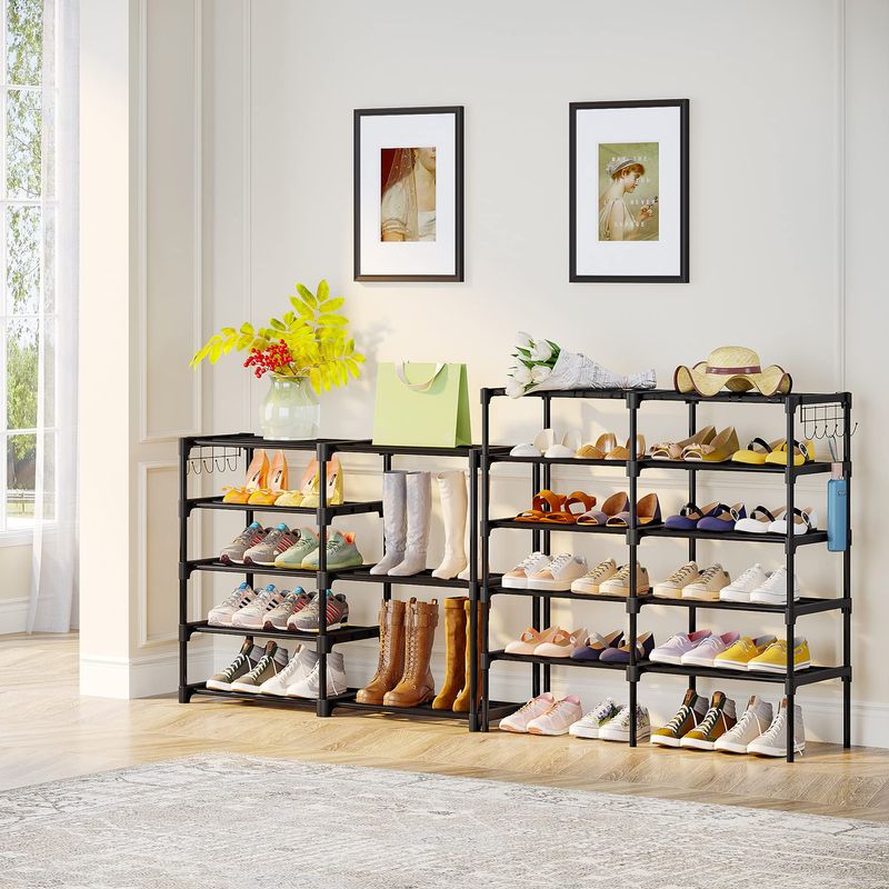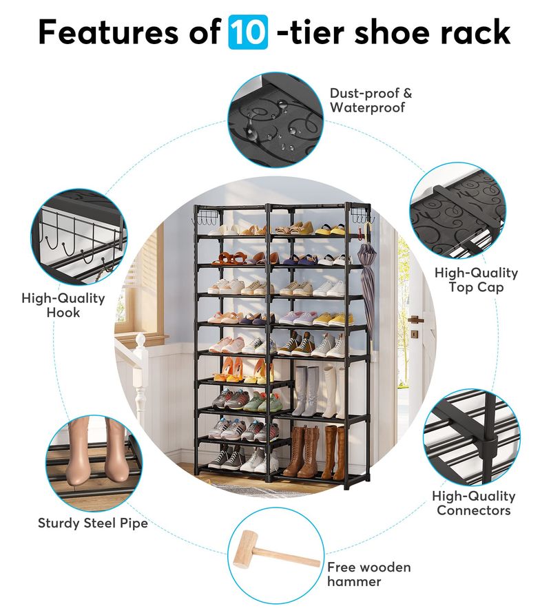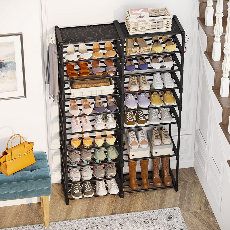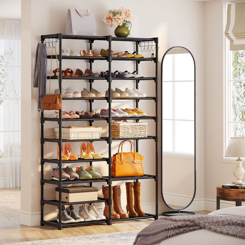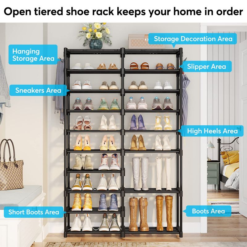 TRIBESIGNS ORGANIZADOR DE ZAPATOS, ESTANTE DE ALMACENAMIENTO DE 32 A 40 PARES, SOPORTE DE 9 NIVELES, PARA ARMARIO, ORGANIZADOR DE BOTAS CON 2 GANCHOS, TORRE APILABLE